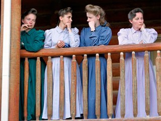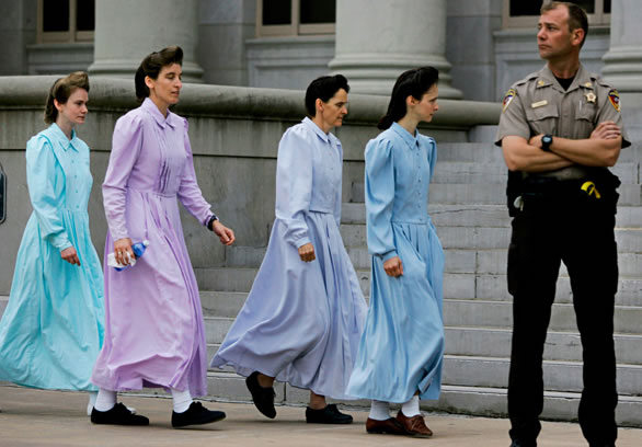 Note how they all hold their hands close to their mouths and adopt similar poses. In all the photos, the poses and facial expressions and body language all look like something out of the 19th century – in some photos, women speaking to reporters seem to duck their heads and look up in an almost stereotypical “submissive wife” way. There’s another photo where the women are stepping about the buses with their kids, and one girl’s head is ducked really low to avoid the gaze of a tall, black state trooper. The odd thing is that this community looked and dressed much differently back in the 50’s, when Short Creek was invaded by the Arizona state police and everyone was rounded up. It’s almost as if with the mandated clothing- and hair- styles for women that were a reaction to that, they decided they had to completely enact the role of the hardy, super-frugal pioneer wives that were their models. They speak in an oddly stilted cadence, probably because they’ve never heard radio or TV, and their only prior experience with public speaking has been giving their “testimony” (faith-promoting stories) in church services.