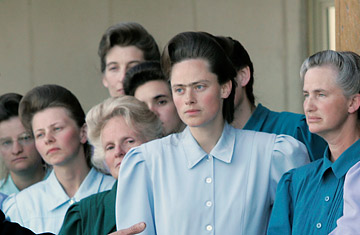 Say what you like about the religion, it’s not natural for women’s faces to be this lean. Even for nursing mothers, these women look like they’re not getting enough to eat. The one in the middle is becoming famous on Flickr for that monobrow, by the way. Their body language is weirdly out of synch with modern life, too. It’s as if they’ve adopted some kind of backwards-engineered emulation of the way women hold their bodies in old, old photographs from the pioneer days. They also remind me of the faces of hardscrabble farmers’ wives from the 30’s Dustbowl photographs – the kinds of photos where you think of words like “famine” and “drought” when you look at them. These women look famished.